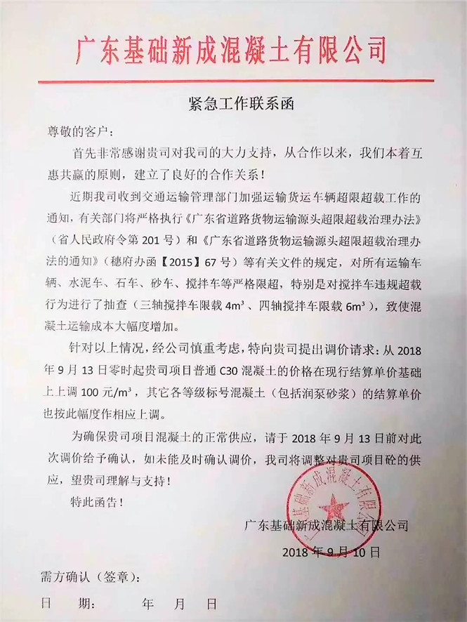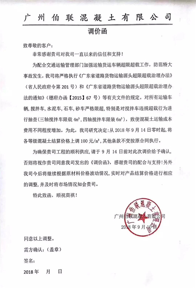 广州伯联混凝土有限公司调价函,从2018年9月14日零时起,将各等级混凝土结算价格上调100元/立方。