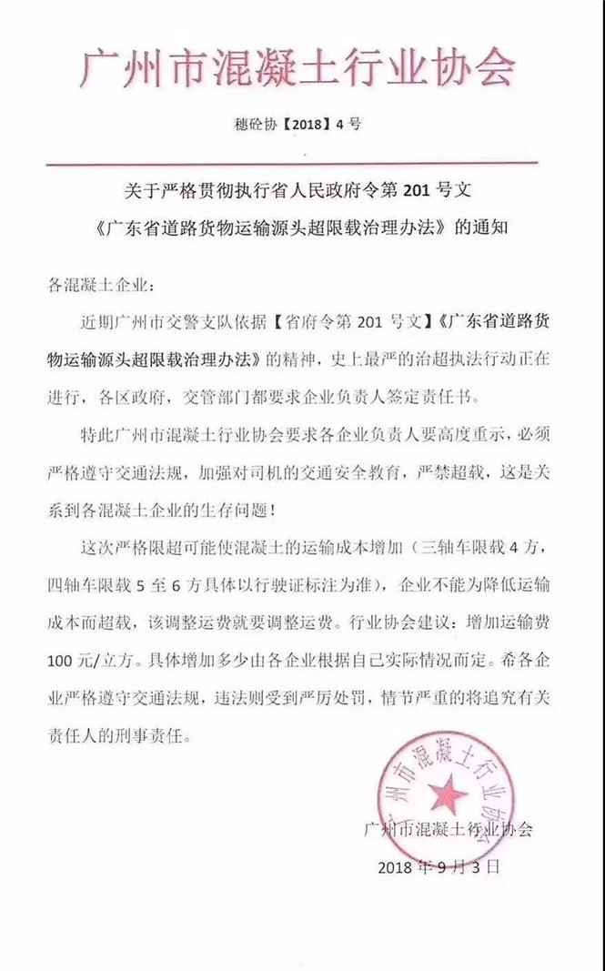 日前,广州市混凝土行业协会为贯彻执行《广东省道路货物运输源头超限裁治理办法》等通知,严格按照三轴车限载4方,四轴车限载5至6方的运输标准,要求企业不能为了降低运输成本而超载,故协会建议各企业增加运输费100元/立方。