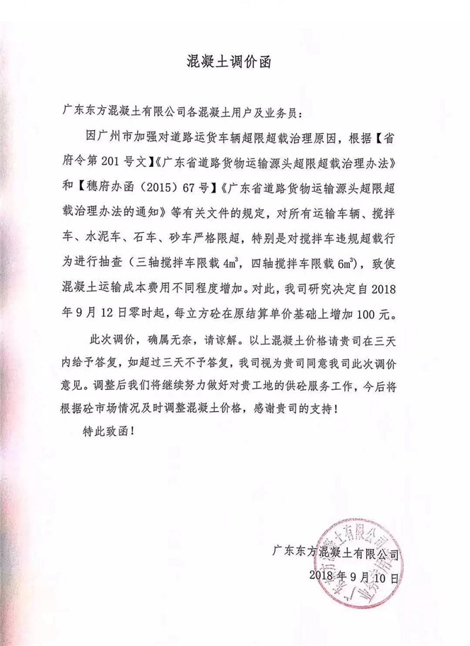 广东东方混凝土有限公司发布调价函,自2018年9月12日零点起,每立方米砼在原结算单价基础上增加100元。