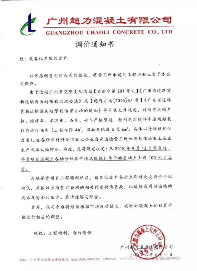 广州伯联混凝土有限公司调价函,从2018年9月14日零时起,将各等级混凝土结算价格上调100元/立方。